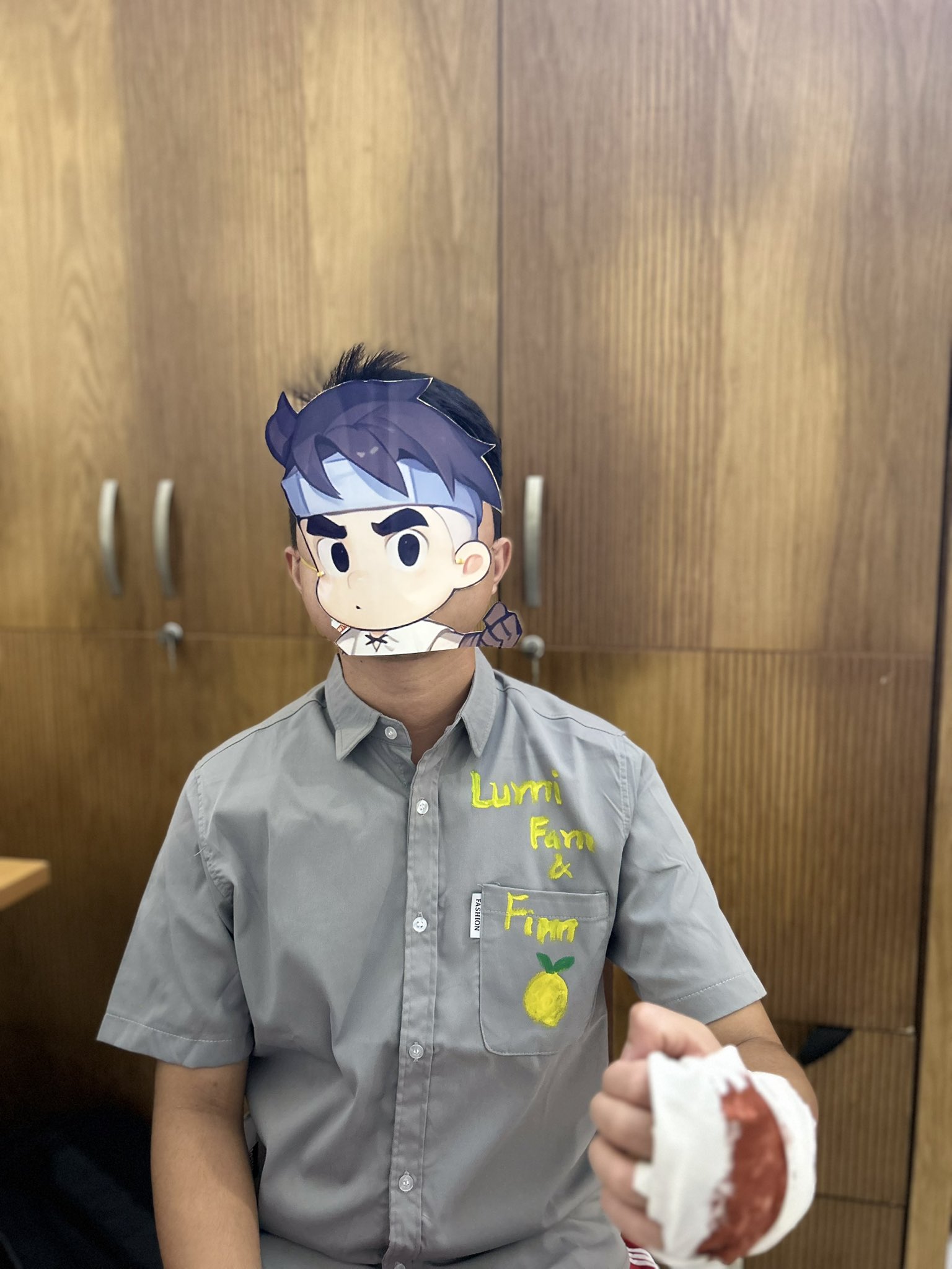 custom shirt, lemon bandage, paper mask, and full-on Lumi manifesto.